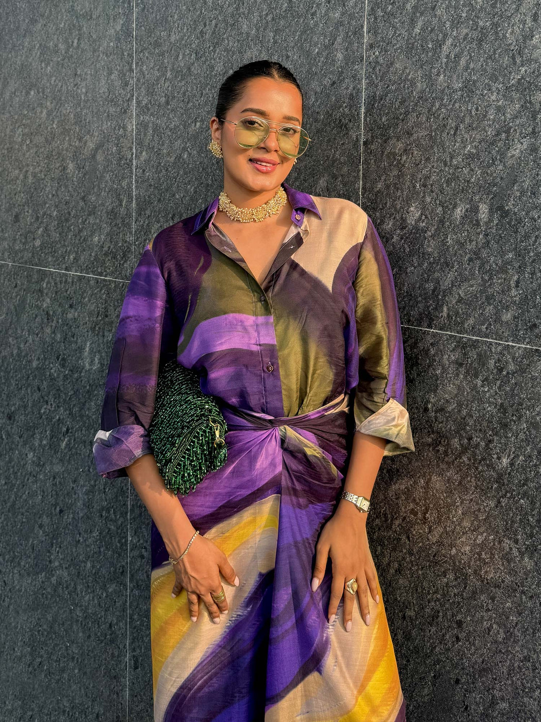 This stunning floral printed set features a shirt with a collar, full sleeves and wooden...