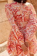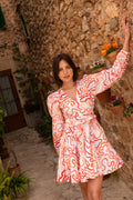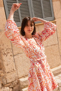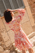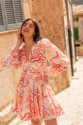 Introducing the stunning Sunray print fit and flare dress. Crafted with a flattering V-neckline that elongates the silhouette, this dress boasts a charming print adorned with brush strokes of pink and orange, adding a playful pop of color to your ensemble. The balloon sleeves lend a touch of romantic flair, while the fit and flare silhouette accentuates your curves in all the right places. Perfect for both casual outings and special occasions, this dress effortlessly transitions from day to night with ease. Embrace your inner artist and exude effortless elegance in this timeless piece.