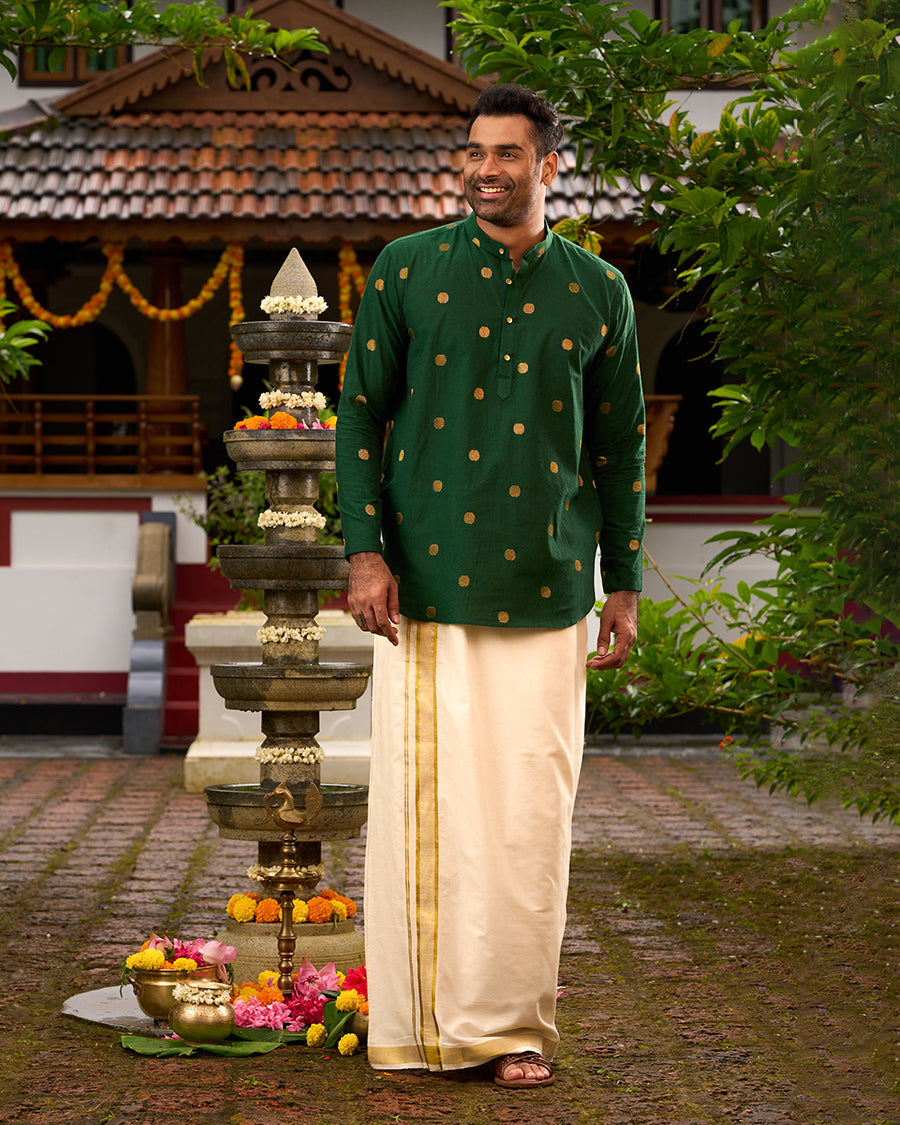 Bottle green short Kurta, perfected with golden polka dots! Mandarin collar, gold buttons, and full sleeves for a distinctive festive look.