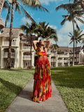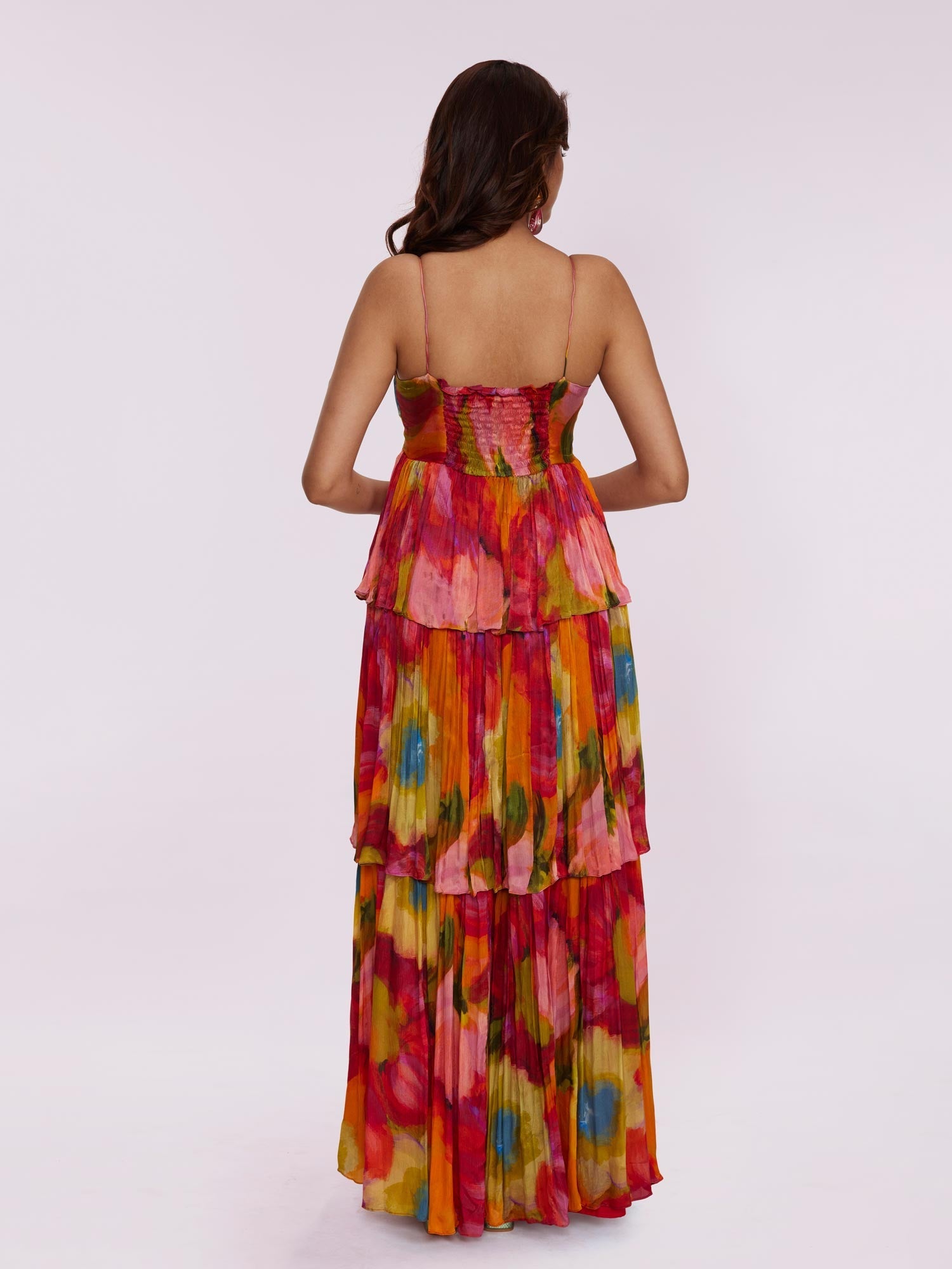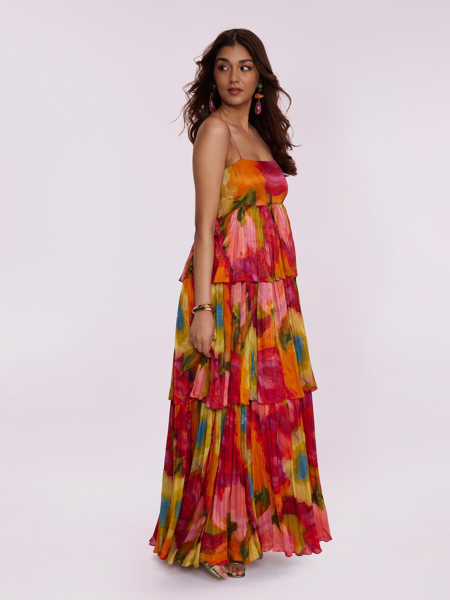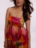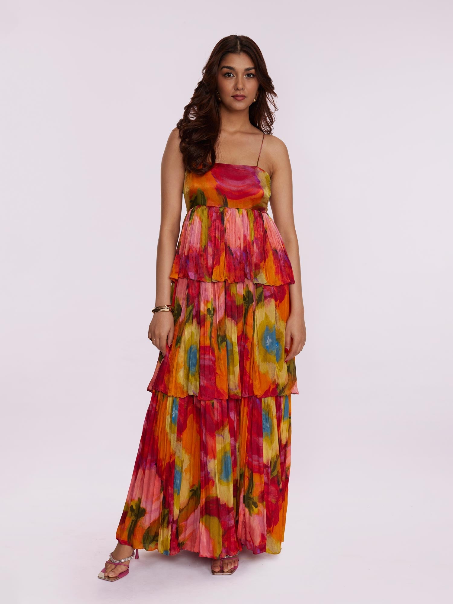 This beautiful printed maxi dress features spaghetti straps and 3 ruffled layers, making this a perfect partywear outfit! The fabric is soft and flowy and the dress makes you feel beautiful inside out.