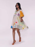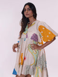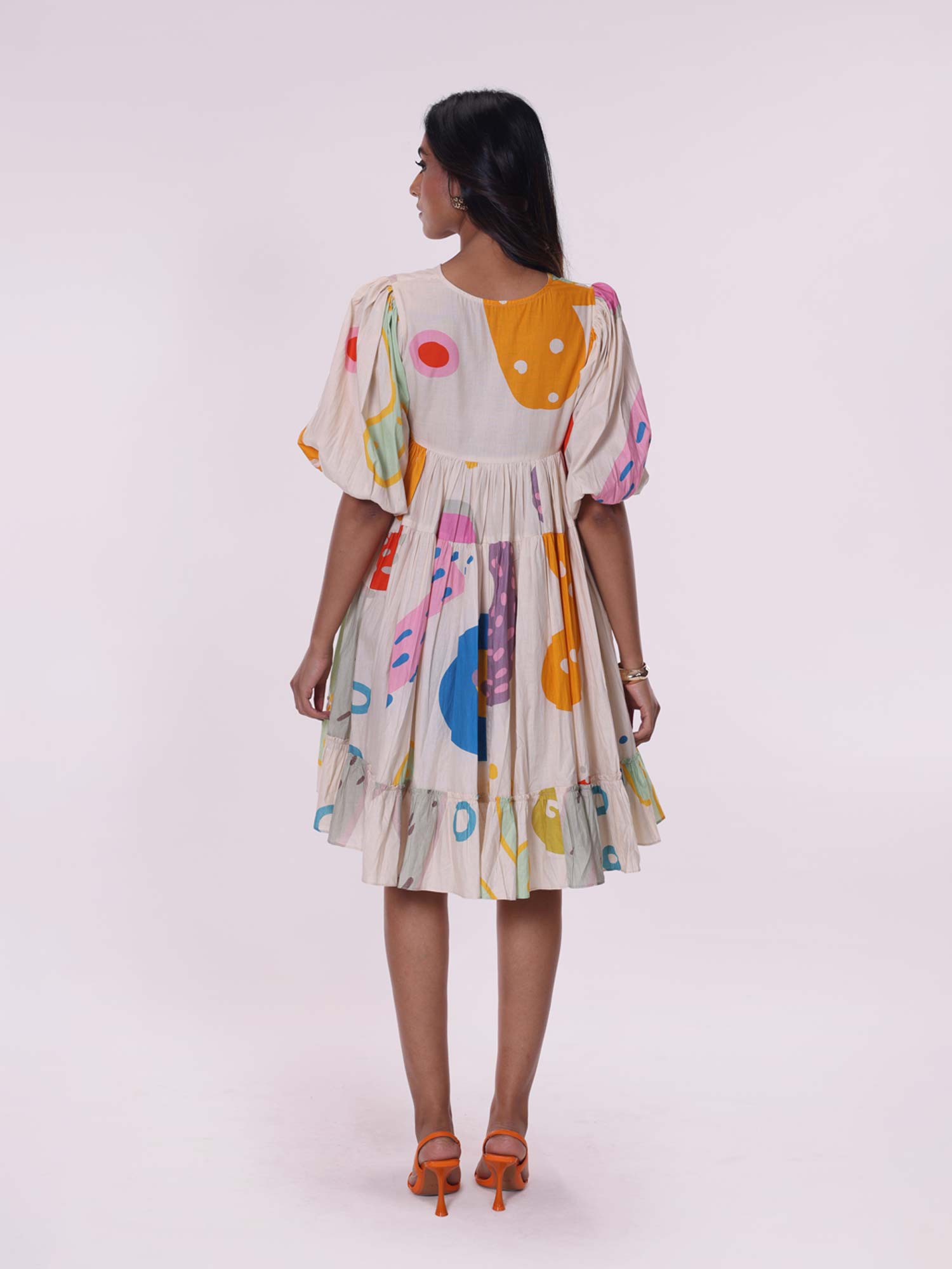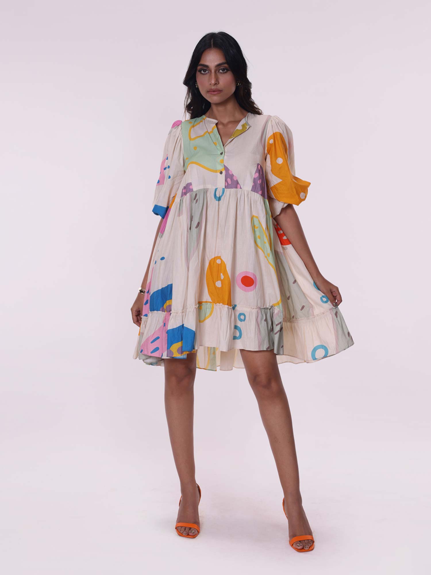 This flary and flowy printed mini dress features buttons at the front with 3/4th sleeves and a ruffled hem. It is a cute, stylish & playful dress.
