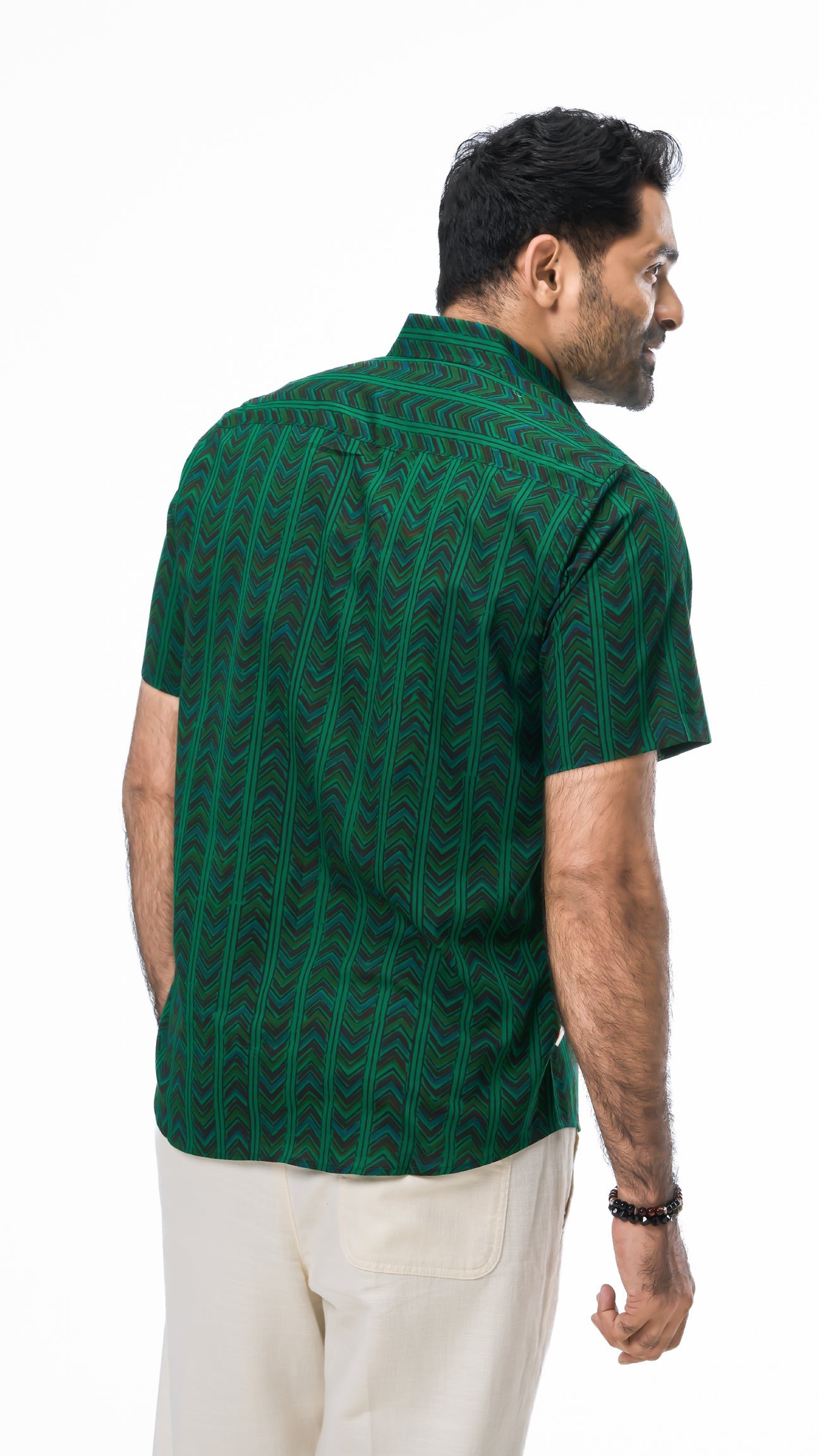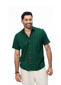 This Green Kalamkari border print shirt features traditional hand-painted designs along the edges, showcasing intricate and vibrant patterns inspired by nature and folklore. The rich green fabric serves as a beautiful backdrop to the colorful motifs, offering a striking yet elegant look. Perfect for adding a cultural touch to casual or semi-formal outfits, this shirt combines timeless artistry with contemporary style.