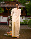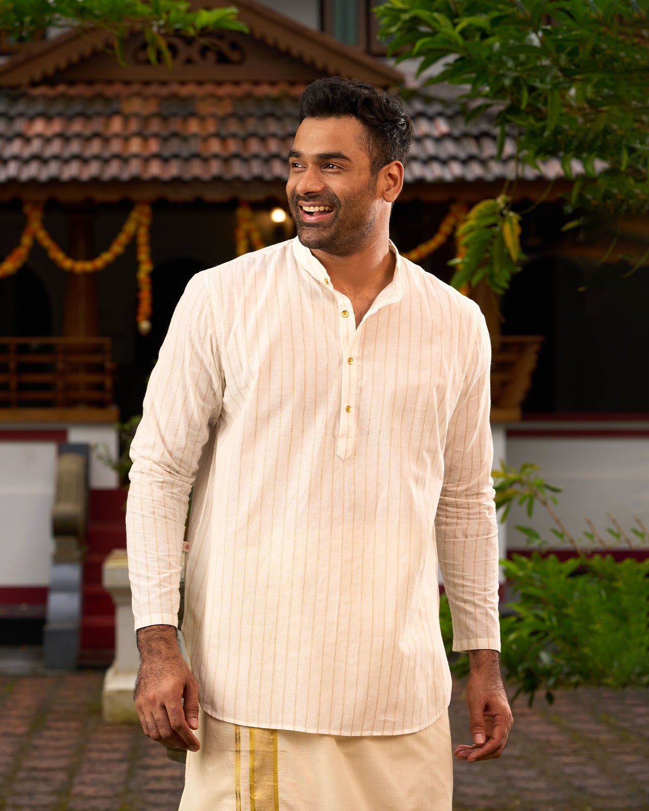 This off-white men's kurta with golden lines, mandarin collar, and gold buttons offers effortless festive elegance.