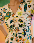 Step into effortless elegance with this whimsical printed midi dress. The dress showcases vibrant motifs in a rich palette of greens, yellows, and blues. The flattering silhouette includes a ruched bodice and puffed sleeves that add a soft, feminine touch, while the midi length creates a graceful flow. Perfect for casual outings or special events, this dress blends comfort with a bold statement, paired effortlessly with flats or heels, this piece is as versatile as it is eye-catching.