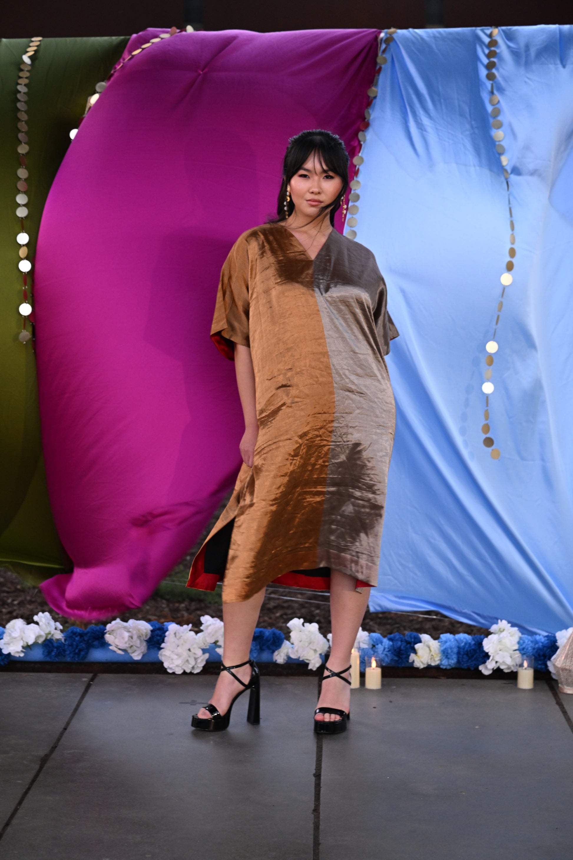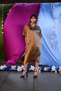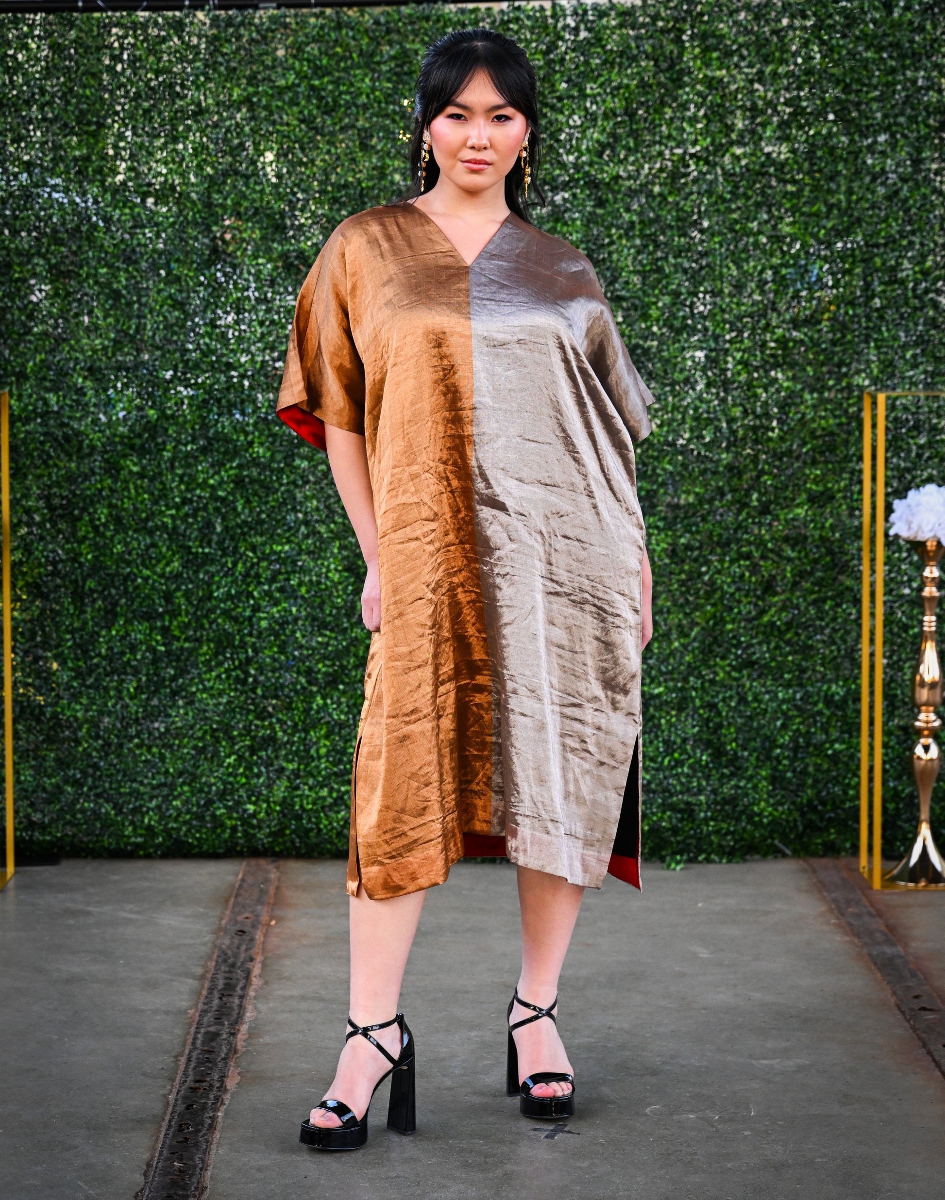 This stunning piece redefines modern occasion wear with its striking half-and-half color block in contrasting metallic tones. Crafted from luxurious, lightweight silk, the fabric drapes beautifully, offering an effortlessly elegant silhouette that is both bold and breathable. The minimalist V-neckline and relaxed fit provide comfort and style, while the discreet side slit adds a touch of movement. Whether you're attending a gala, a summer wedding, or a festive celebration, this kaftan is a testament to sophisticated artistry, ensuring you make a memorable entrance wherever you go.